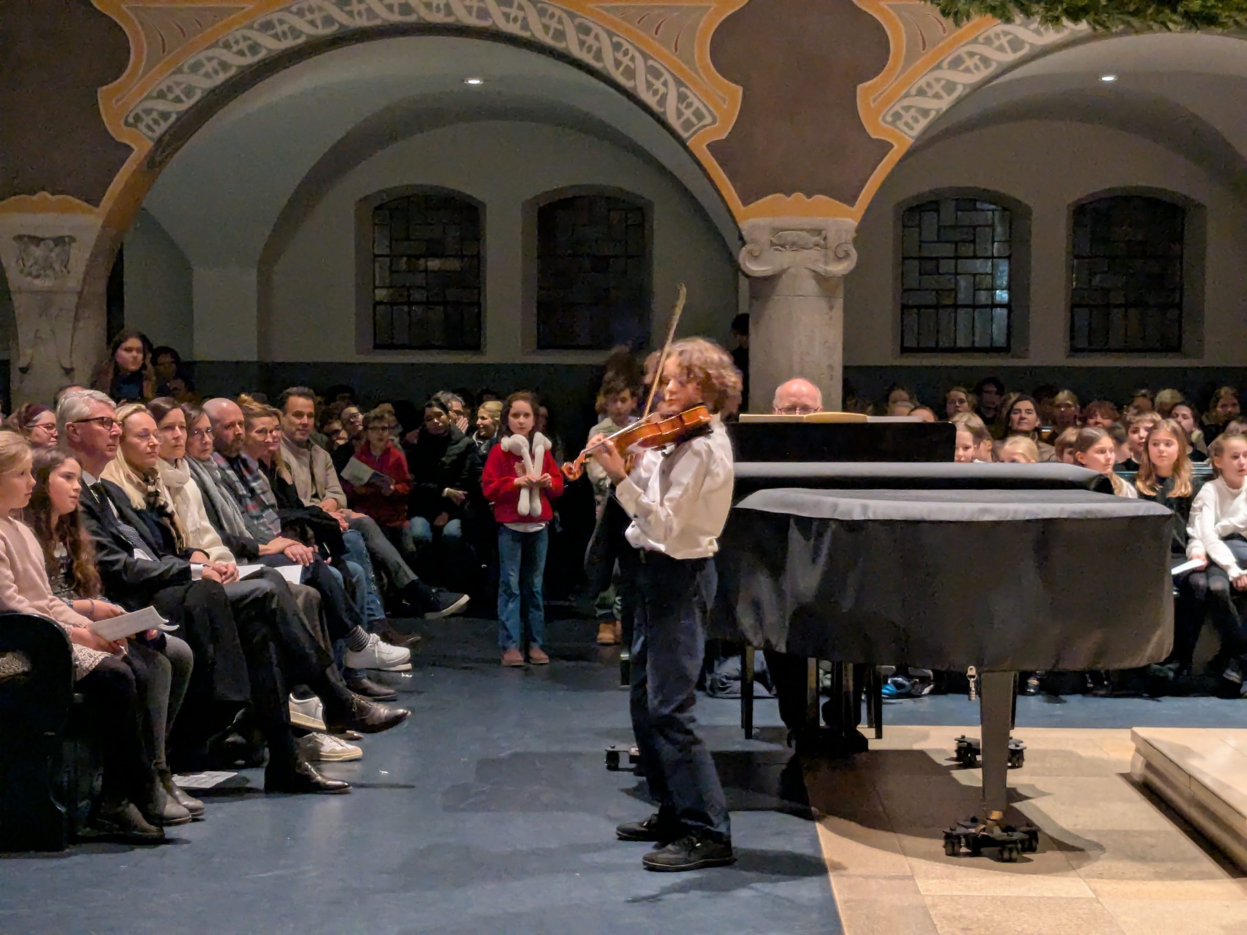 Am Montag, den 15.12. fand das diesjährige Weihnachtskonzert des Maximiliansgymnasiums statt. Hierzu boten unsere Schülerinnen und Schüler ein abwechslungsreiches Programm klassischer und moderne Werke dar. Untermalt wurden die Stücke durch besinnliche Texte von Frau Prügl. Besonderer Dank gilt an dieser Stelle natürlich allen Schülerinnen und Schülern, die durch ihre Beiträge dem Abend einen besonderen Glanz verliehen haben. Dieser wäre nicht ohne das große Engagement der Musiklehrkräfte Frau Akollor, Herrn Schmid, Herrn Mederl und Herrn Waas zu Stande gekommen. Die gesamte Schulfamilie ist besonders Herrn Waas zu Dank verpflichtet, dessen letztes großes Konzert dies zum Abschluss seiner 33-jährigen Dienstzeit am Maximiliansgymnasium darstellte. Sein Einsatz und sein Wirken im Bereich Musik und als Pädagoge waren stets herausragend, was mit langanhaltendem Applaus und stehende Ovationen gewürdigt wurde.
