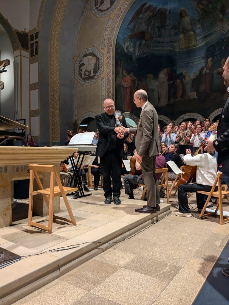 Schülerinnen und Schüler des Maximiliansgymnasiums sowie die Kuratoren Hotz und Dr. Pfaffel ehrten den Jubilar mit insgesamt vier musikalischen Geschenken: Paul Hofhaymers Horaz-Ode I 8 dargeboten vom Vokalensemble des MAX unter Leitung von StD Anton Waas; Dr. Pfaffel und OStD Hotz: Piano und Querflöte mit Stücken von G.F. Händel (Sonate in F-Dur) und Philipp Gauberts Divertissement Grec für Flöte und Piano; der junge MAX-Schüler Damian Georgiev begeisterte und berührte mit seiner Violin-Darbietung von Paul Ben-Haims Berceuse Sfaradite Jubilar und Gäste.