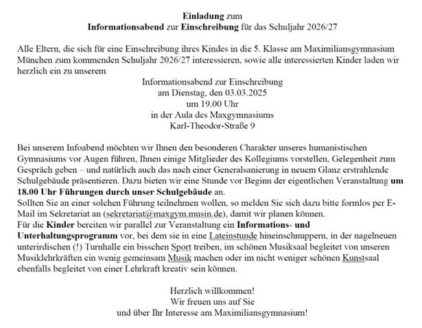 Informationsabend zur Einschreibung am Dienstag, den 03.03.2026 um 19.00 Uhr in der Aula des Maxgymnasiums Karl-Theodor-Straße 9